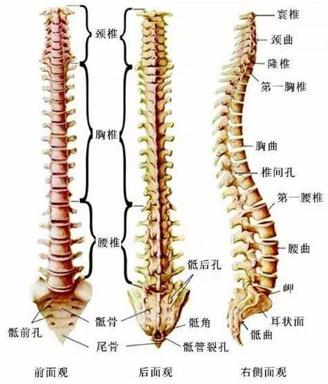 脊柱的组成:由颈椎7块、胸椎12块、腰椎5块、1块骶骨和1块尾骨,借椎间盘、韧带、和关节紧密连结而成。