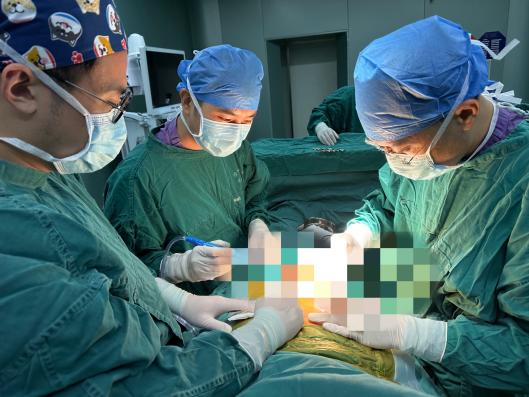 经过前期充分的围手术期准备,在麻醉科及手术室护理团队的精心配合下,权红光教授及其医疗团队王隽副主任医师、陈宝鹤、刘阳、宁飞龙及张文卓主治医师等为患者进行了手术治疗。术中探查疝内容物为远端约120cm回肠及其系膜和盲肠、阑尾等组织。患者突出体外的疝内容物较多,还入腹腔困难,但权红光教授考虑到患者高龄,基础疾病较多,机体功能欠佳,为患者实施了腹壁组织结构分离手术,有效增加了腹腔容积,减少了腹壁张力。术中多次腹内压监测,避免了肠管或网膜切除等主动减容的可能,进一步减少了患者手术创伤和腹内高压风险,为患者顺利实施了右侧腹股沟疝无张力修补术。术后患者在中医药的快速康复治疗下,恢复良好,短时间内平安出院。