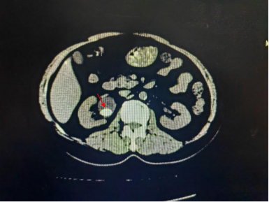 患者入院行腹部CT检查。发现右肾结石,大小约2.0cm