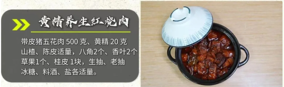 带皮猪五花肉500 克、黄精20克、山楂、陈皮适量