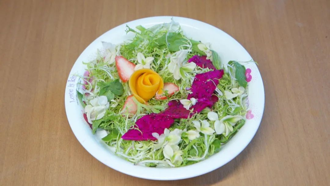 雪莲花沙拉 配料:雪莲花5-8克、生菜1颗、黄瓜1根、番茄1个、紫甘蓝50克、牛油果1个