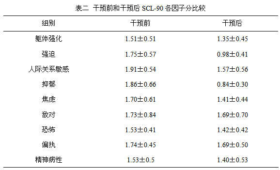 综合项目强化培训干预前SCL-90因子分与国内青年常模比较,各因子分均高于全国青年常模(P<0.05),见表一。综合项目强化培训干预后护生SCL-90因子分均下降(P<0.05),见表二。