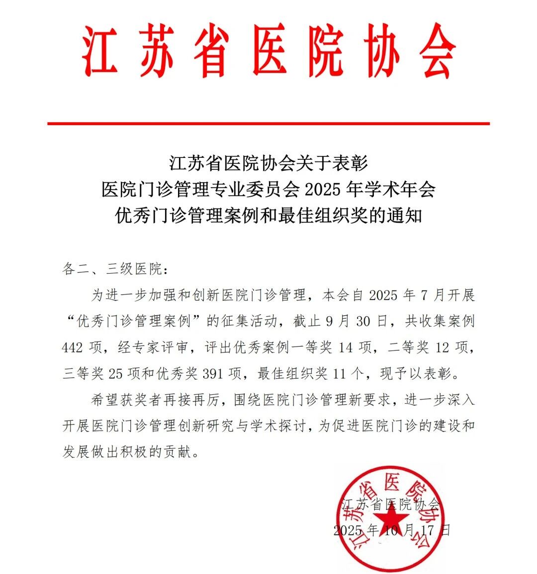 近日,江苏省医院协会门诊管理专业委员会2025年学术年会优秀管理案例评比结果正式揭晓。徐州市中医院门诊部与检验科申报的案例分别荣获二等奖与优秀奖,充分展现了我院...