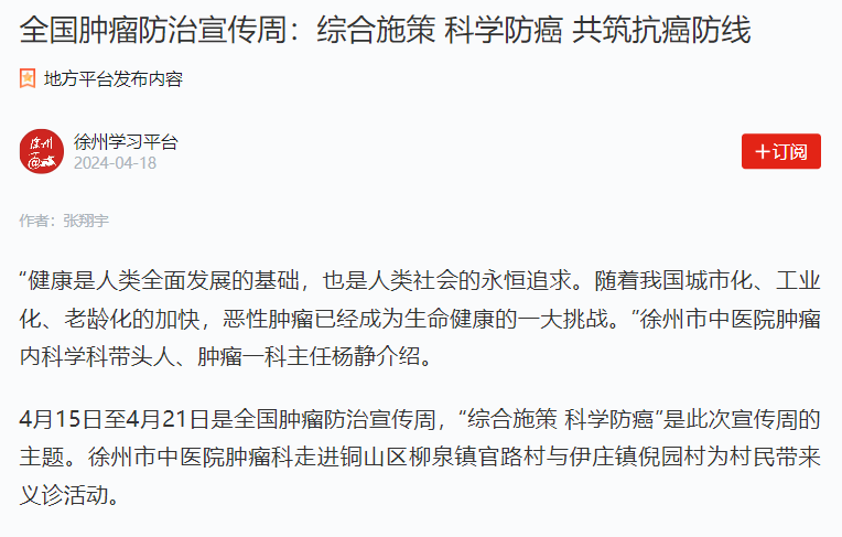 今年肿瘤防治宣传周主题是“综合施策?科学防癌”,旨在按照《健康中国行动—癌症防治行动实施方案(2023—2030年)》相关要求,扩大癌症防控科普宣传,倡导每个人...