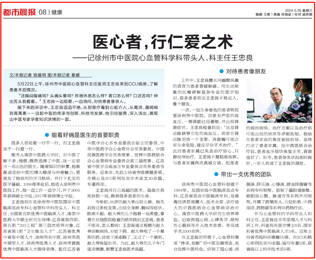 5月22日上午,徐州市中医院心血管科主任医生王忠良来到病房,了解患者术后的情况。 “还胸闷胸痛吗?头痛头晕吗?昨晚休息怎么样?胃口怎么样?口还苦吗?伸出...