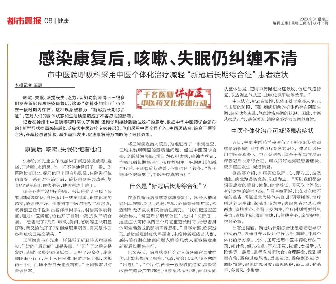 呼吸科采用中医个体化治疗减轻“新冠后长期综合征”患者症状 咳嗽、失眠、味觉丧失、乏力、认知功能障碍……很多朋友在新冠病毒感染康复后,这些“意料外的症状...