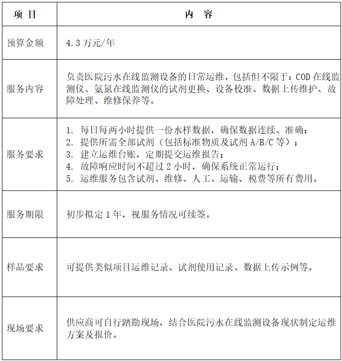 为保障医院污水在线监测系统稳定运行,确保监测数据准确、传输合规,我院拟开展污水在线监测运维项目,现面向社会公开开展市场调研,欢迎符合条件的供应商积极参与。相关事项公告如下:
