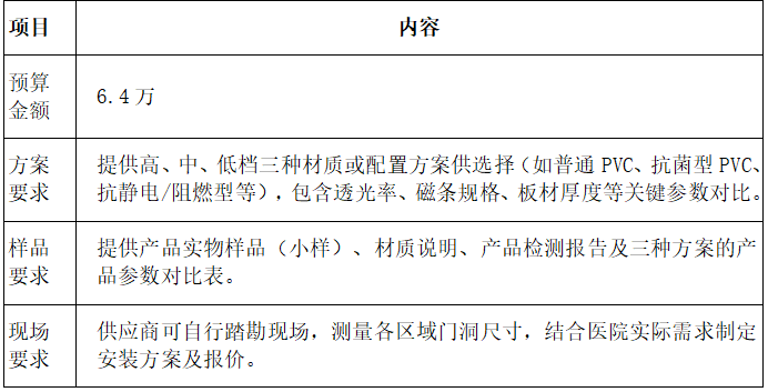 供应商需根据医院实际使用场景(门诊大厅、病房通道、手术室缓冲区等),提供高、中、低档三种配置方案。方案应包含材质类型、环保等级(无异味、抗菌、易清洁)、透光率、板材厚度、磁条尺寸、安装方式(悬挂式)、质保期限等关键指标对比。