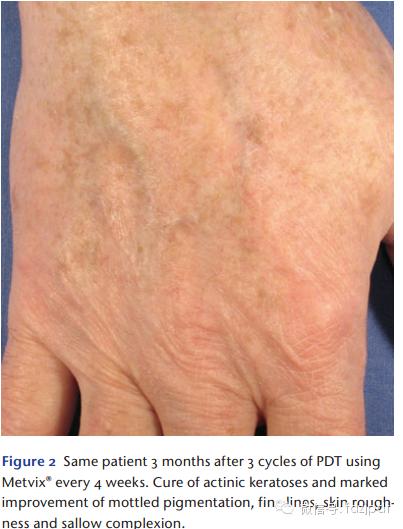Zane等观察了红光光动力治疗AK及重度光损伤患者,结果显示色沉、细纹、粗糙等均有显著改善。Issa等观察到,皱纹、皮肤质地及光滑度,在治疗后6个月时比3个月时又有进一步改善。也可以在治疗前进行CO2激光或ER:YAG激光预处理,可以增强光敏剂的穿透及减少光照剂量。