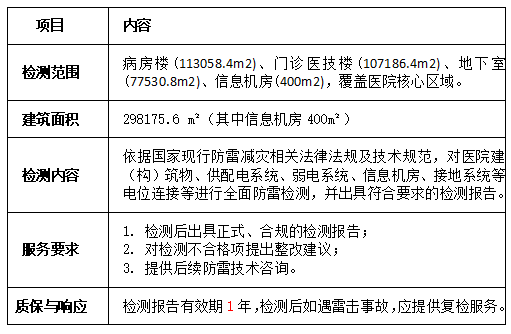 为保障医院夏季雷雨季节的安全生产,防止雷击事故发生,保护后勤设备及人员安全,我院拟开展核心区域防雷检测服务,现面向社会公开开展市场调研,欢迎符合条件的供应商积极...