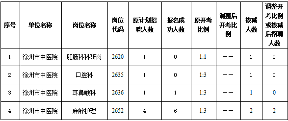 根据《徐州市中医院2026年公开招聘非在编人员公告》要求,结合2026年4月7日-11日实际报名情况,经研究决定:对未达到开考比例的岗位,相应核减招聘计划,直至...