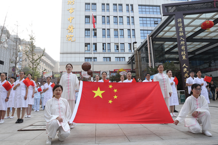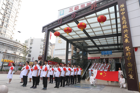 10月1日上午8点,市中医院门诊楼广场人头攒动,歌声飞扬,在众多市民的关注参与下,医务人员手持国旗,唱红歌,办义诊,展示中医药文化,以丰富多彩的系列活动庆祝祖国七十华诞。