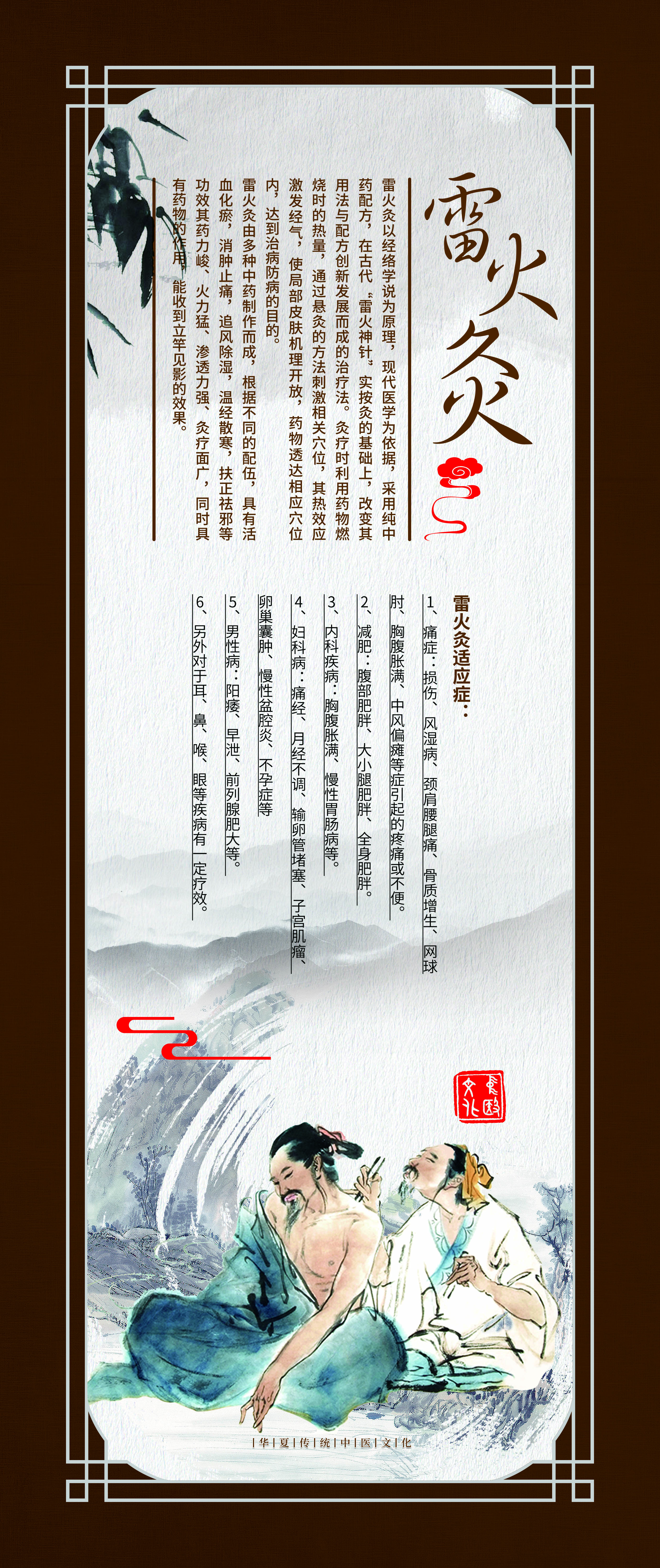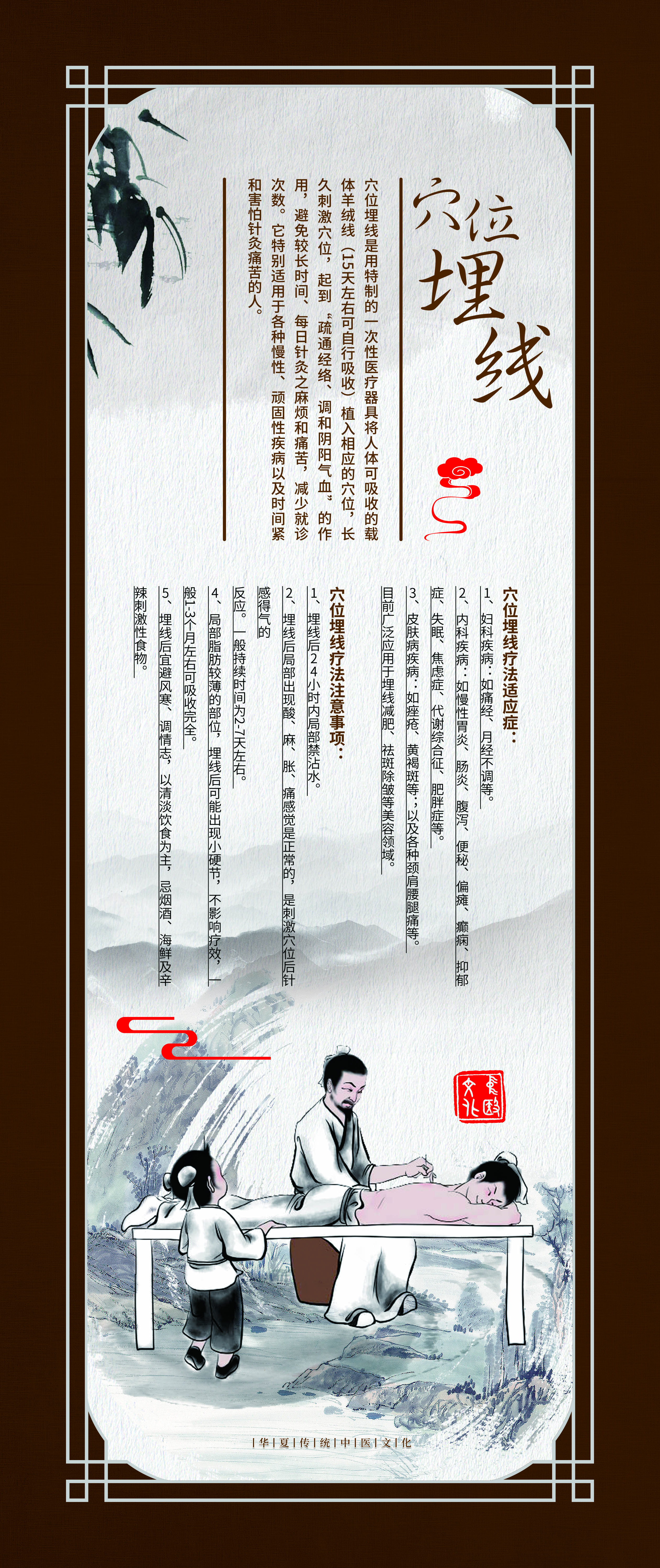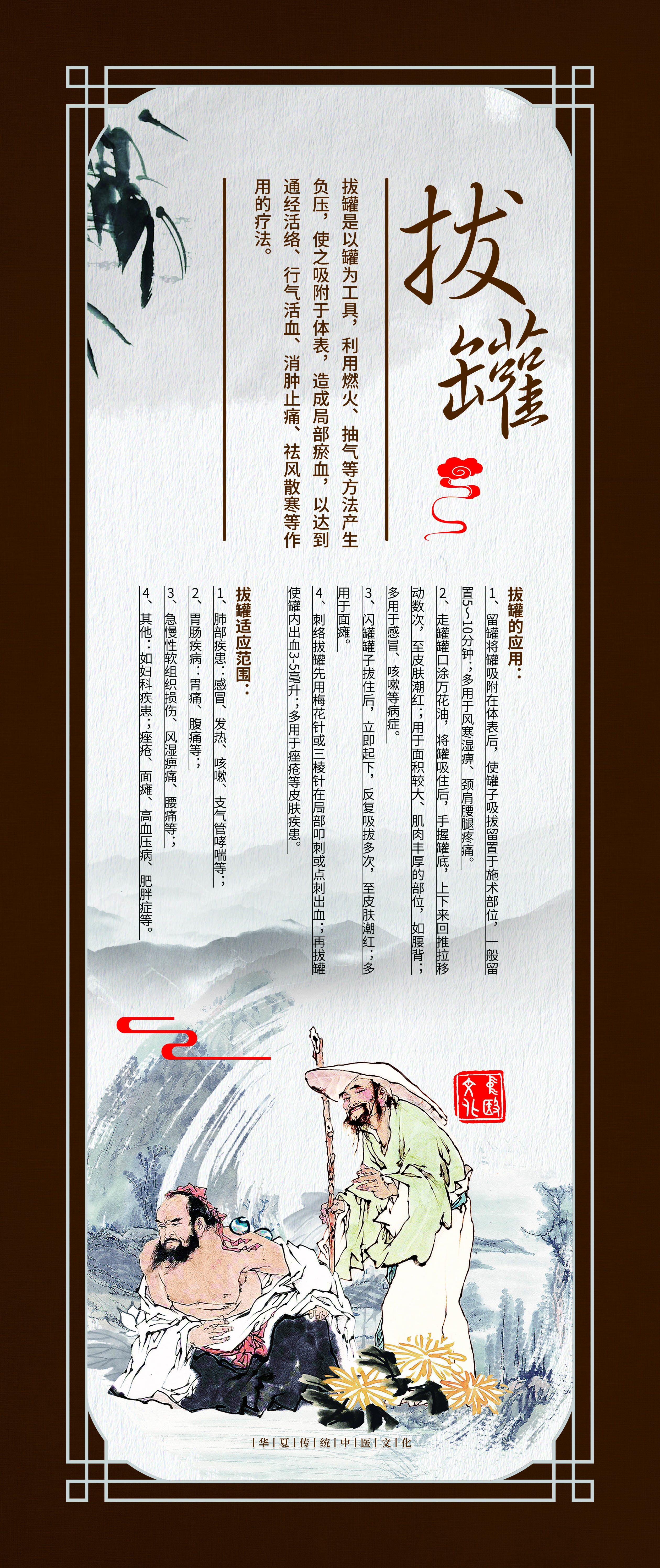 这组《中医外治法装饰壁画》选取了疗效确切,使用广泛的九种疗法,包括针刺、推拿、中药熏洗、拔罐、长蛇灸、中药药浴、穴位埋线、雷火灸、刮痧。设计理念以中国风为元素,配以咖啡色画框边条,古朴大方。每幅壁画都包含疗法介绍、疗效作用、适应症等文字说明,并配以古代治疗图画。
