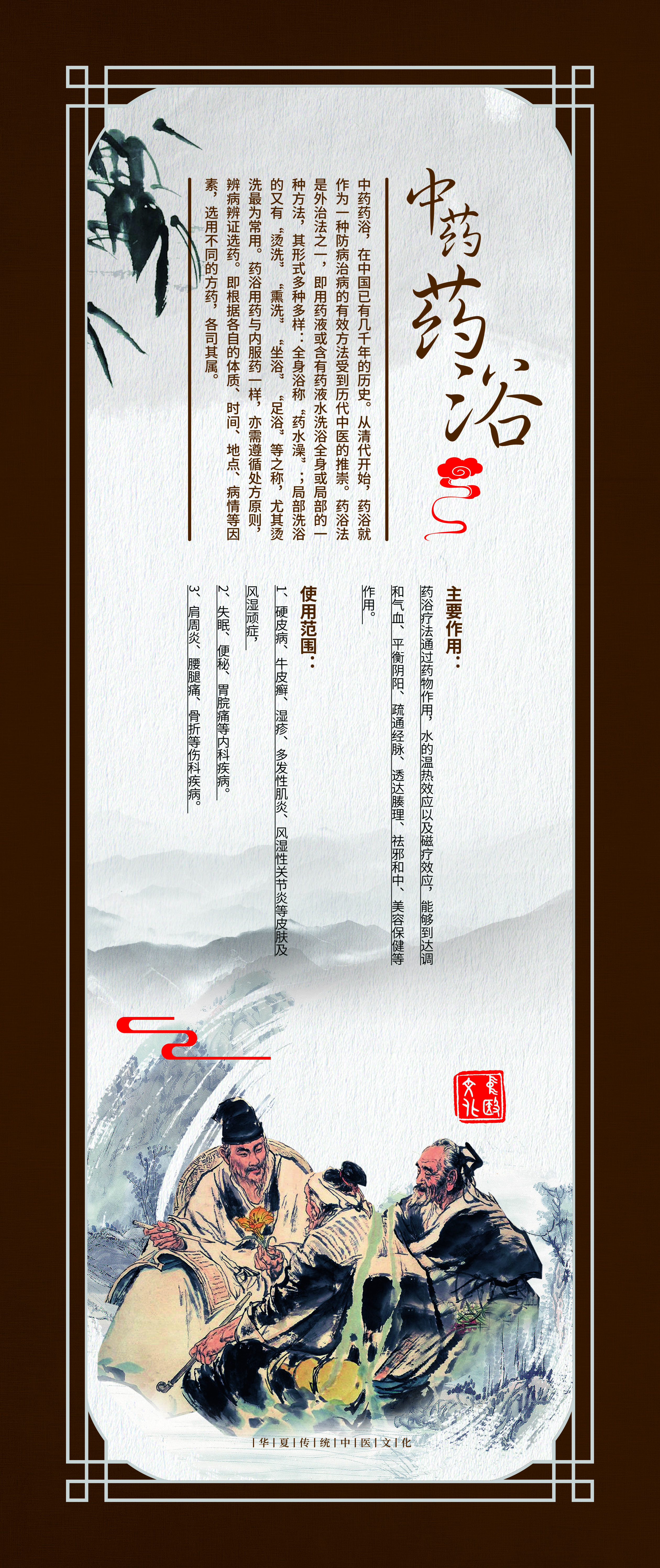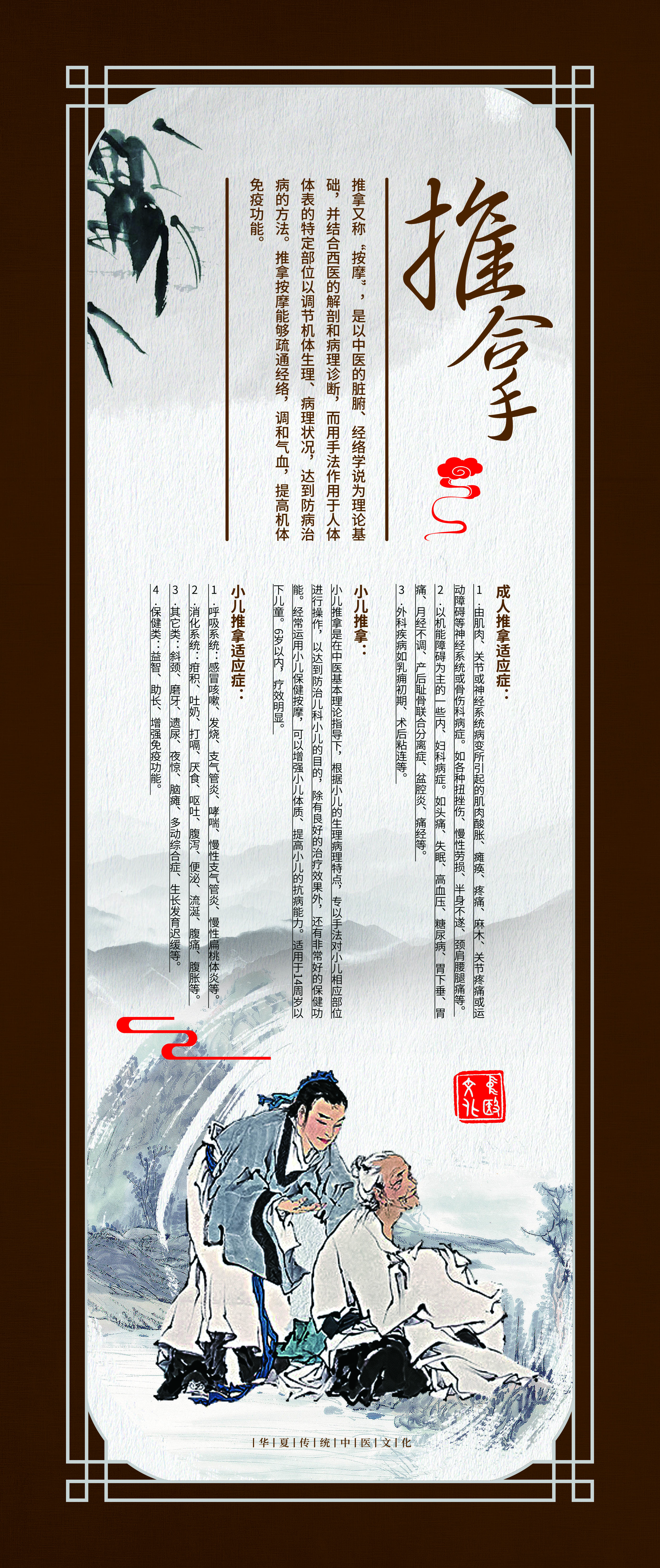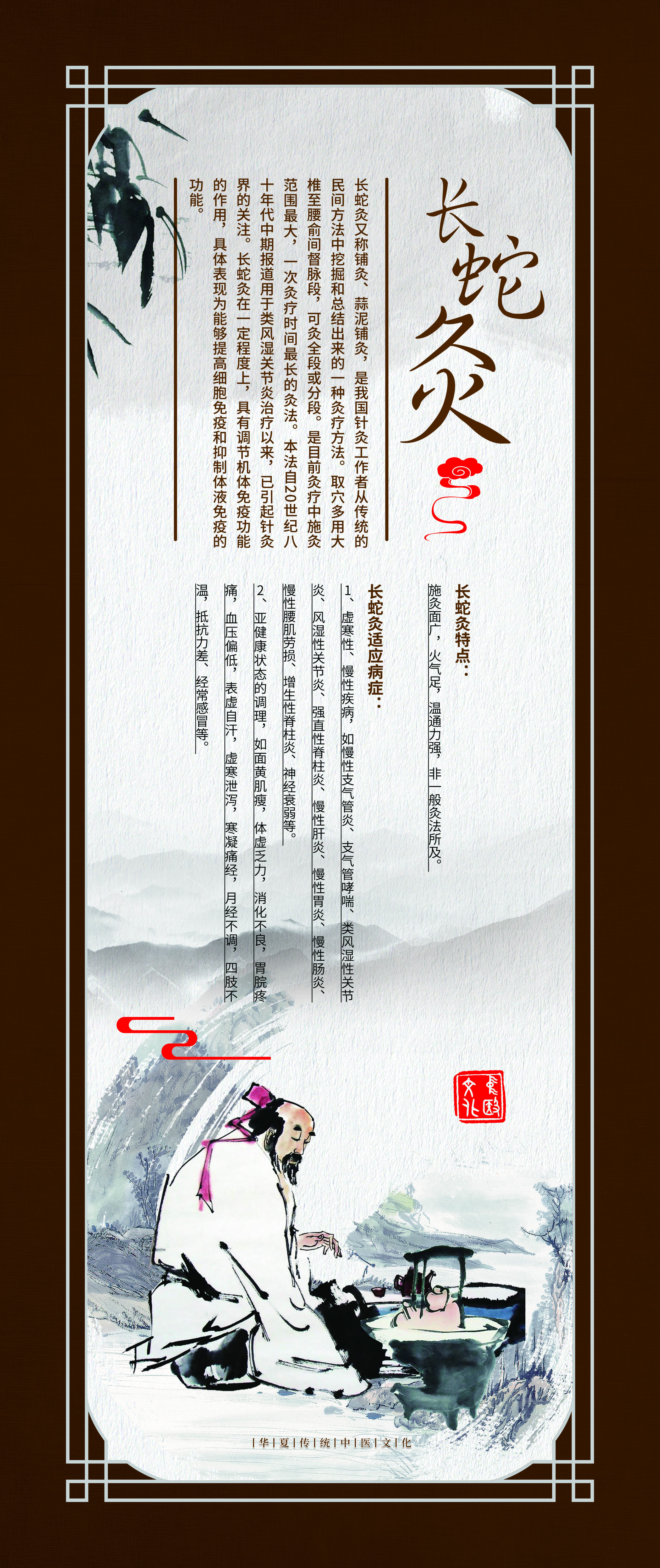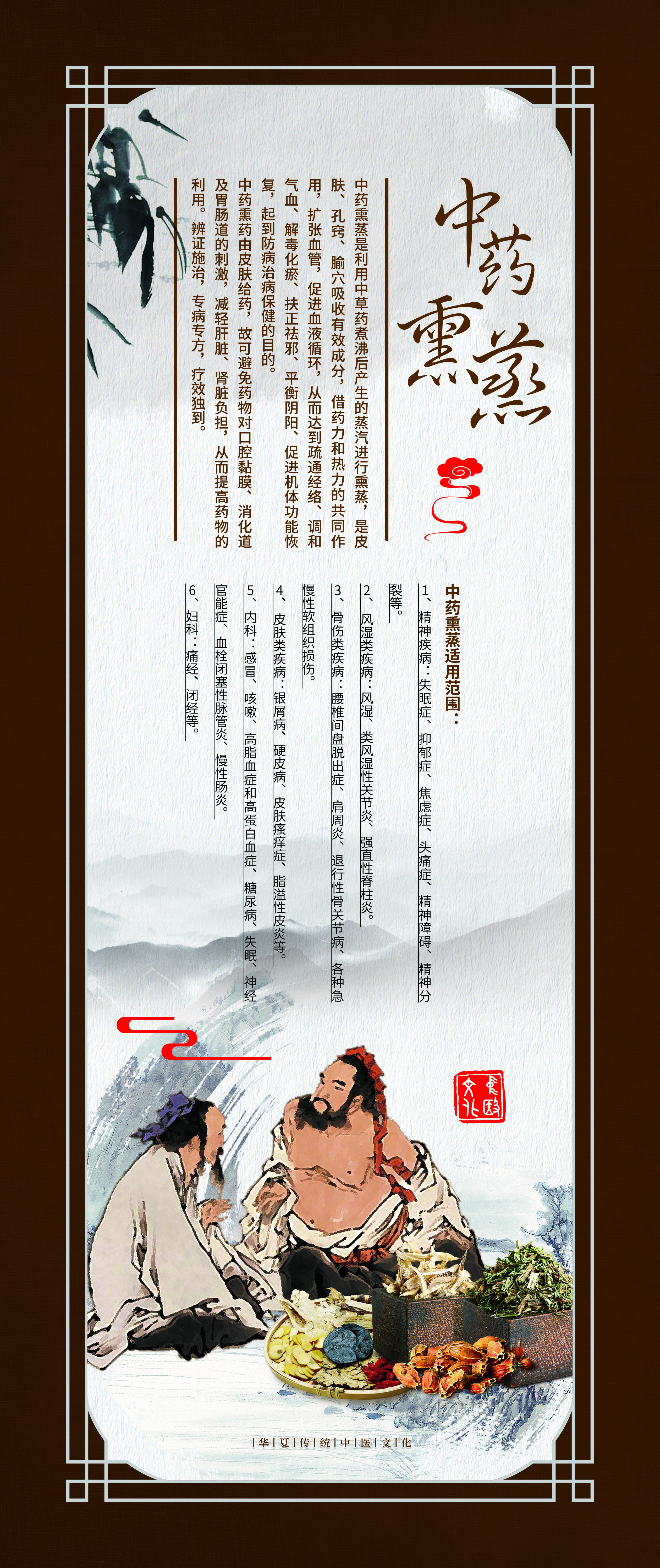 这组《中医外治法装饰壁画》选取了疗效确切,使用广泛的九种疗法,包括针刺、推拿、中药熏洗、拔罐、长蛇灸、中药药浴、穴位埋线、雷火灸、刮痧。设计理念以中国风为元素,配以咖啡色画框边条,古朴大方。每幅壁画都包含疗法介绍、疗效作用、适应症等文字说明,并配以古代治疗图画。