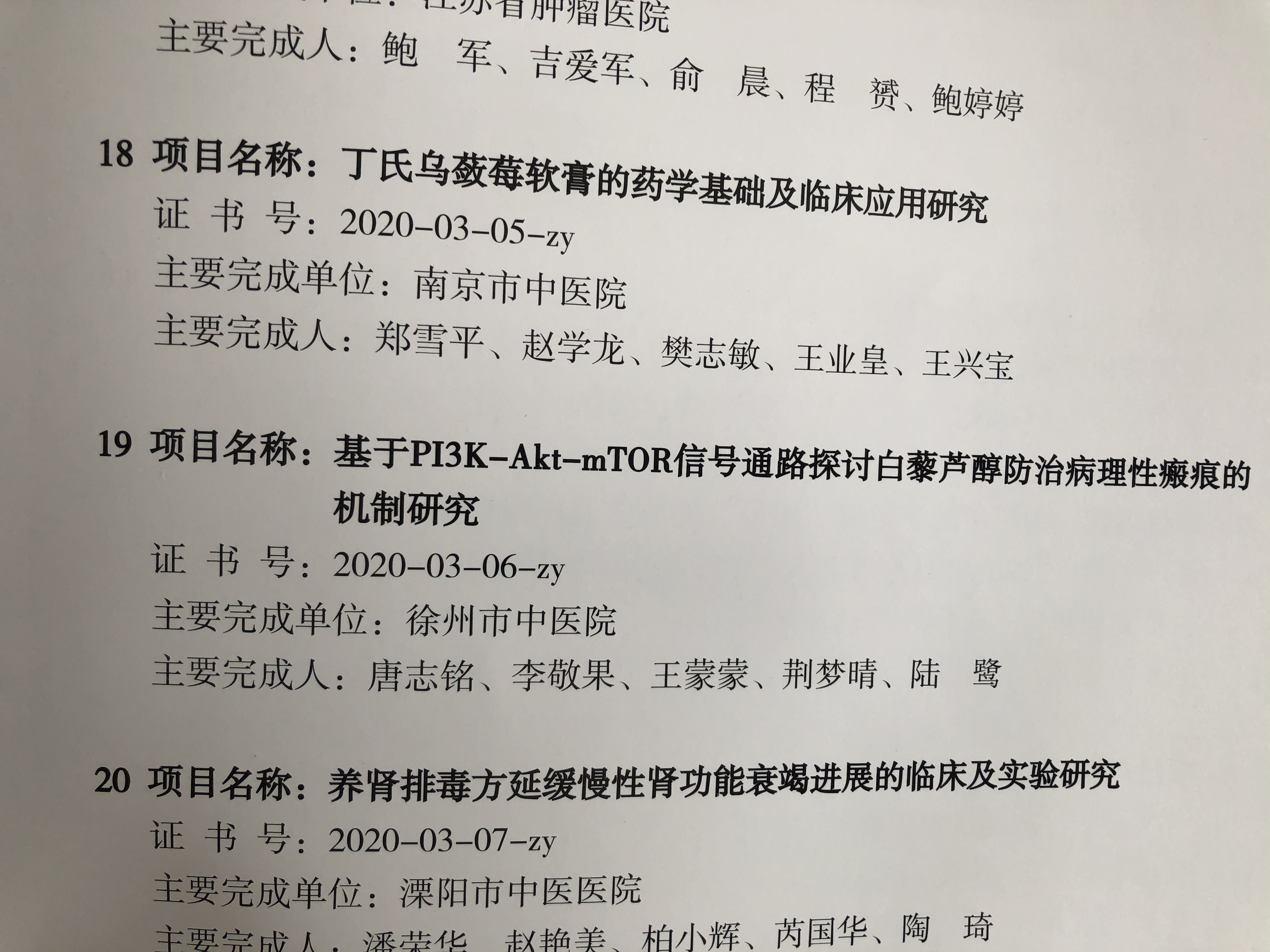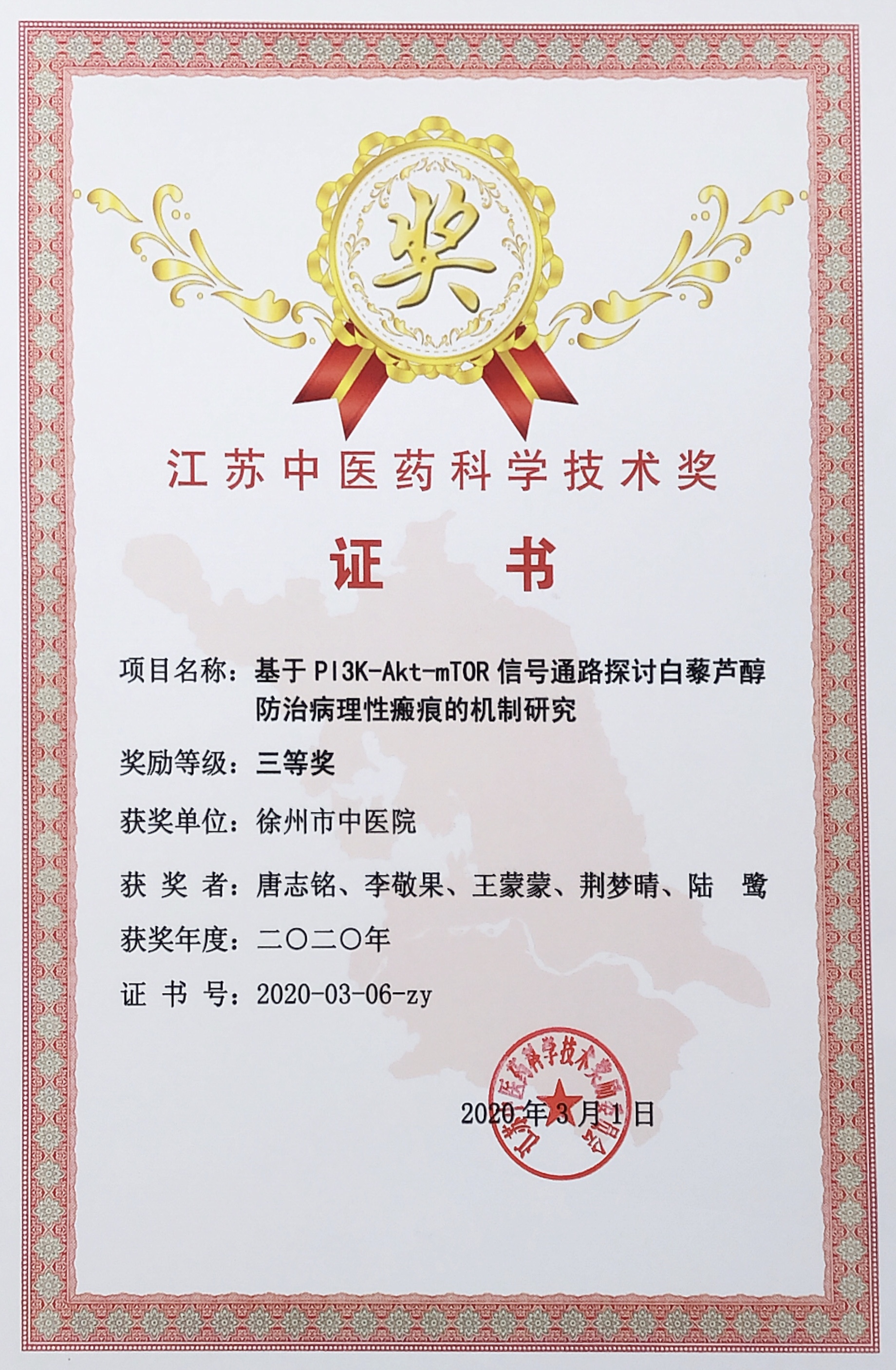 近日,徐州市中医院皮肤科唐志铭申报的科研项目《基于PI3K-Akt-mTOR信号通路探讨白藜芦醇防治病理性瘢痕的机制研究》经过江苏中医药科学技术奖评审委员会初审、复审、终审,最终获评第十一届江苏中医药科学技术奖三等奖。