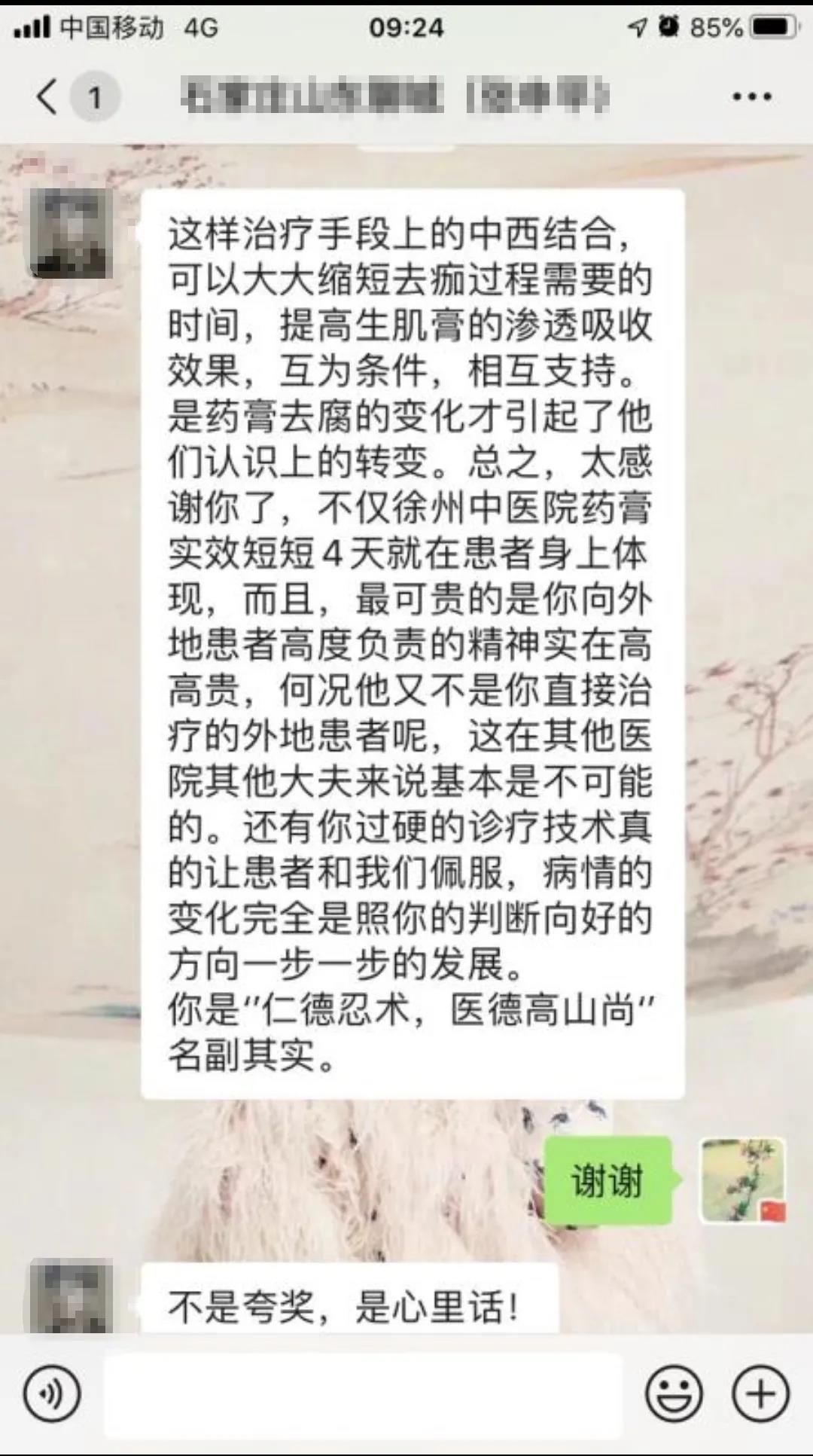 徐州市中医院采用中医外用膏药——祛腐生肌膏、生肌散等治疗陈年黑痂顽疾,不仅消除了患者多年病痛,还使患处去腐生肌,受到普遍认可和赞叹。