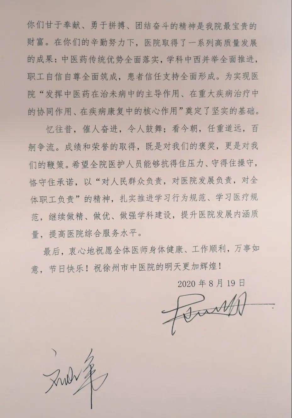 最后,衷心地祝愿全体医师身体健康、工作顺利,万事如意,节日快乐!祝徐州市中医院的明天更加辉煌!