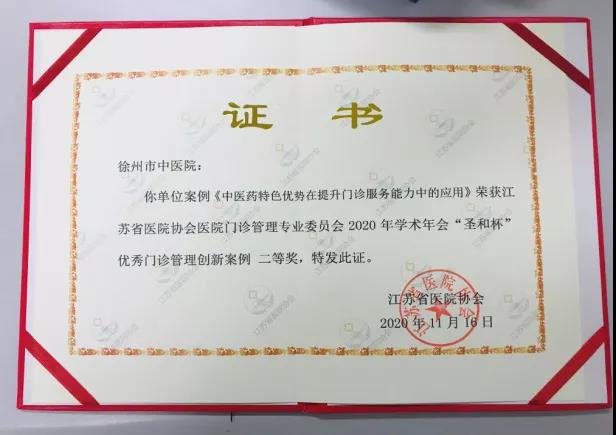 当前位置: 首页>【祝贺】徐州市中医院荣获“江苏省医院协会门诊管理专业委员会2020年学术年会‘圣和杯’优秀门诊管理创新案例奖”