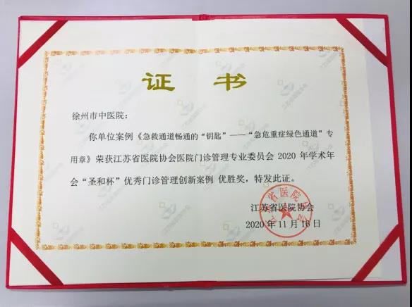 会议表彰了“优秀门诊管理创新案例”,徐州市中医院此次申报的《中医药特色优势在提升门诊服务能力中的应用 》和《急救通道畅通的“钥匙”——“急危重症绿色通道”专用章》案例分别荣获二等奖、优秀奖。