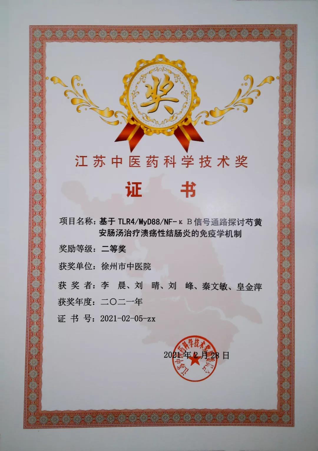 徐州市中医院自主研发的中医药研究成果“基于TLR4/MyD88/NF-kB信号通路探讨芍黄安肠汤治疗溃疡性结肠炎的免疫学机制”获得二0二一年江苏省中医药科学技术二等奖,课题负责人李晨代表课题组上台领奖。