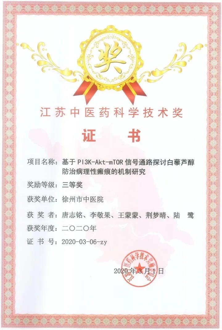 同期我院课题“基于PI3K-Akt-mTOR信号通路探讨白藜芦醇防治病理性瘢痕的机制研究”获得二0二0年江苏省中医药科学技术三等奖,课题负责人唐志铭上台领奖。
