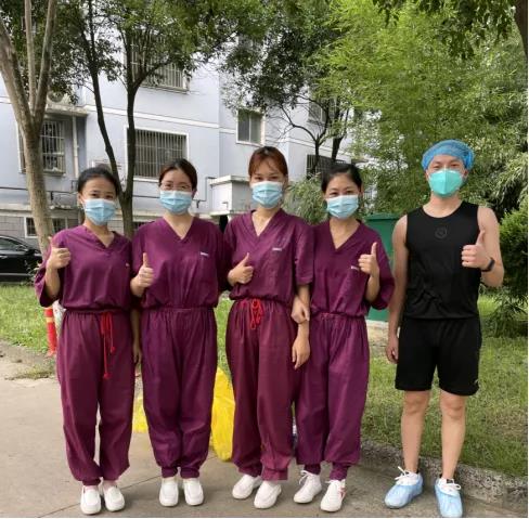 社区的赵书记十分关心我们,他一早赶来,在协助我们划分好穿脱防护服的区域后,热情地问道:“你们还需要什么帮助?采样过程中需要助手吗?”我们答道:“谢谢赵书记!我们可以自己解决,有问题会随时找您帮忙的!”于是,我们从早上6点开始便紧张地忙碌起来,直到10点多,当我们脱下防护服的时候,里面的衣服已经湿透,汗水直往下落,被汗水泡得皱巴巴的双手已经苍白得好像不是自己的。就这样,我们一直工作在户外三十多度的高温下,一个战友脱,一个帮忙照看着的,而另一个又马不停蹄地开始检测,我们的每一步都小心翼翼有条不紊……