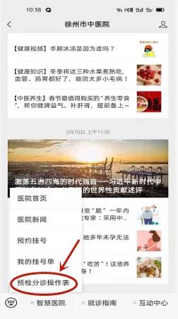 关注“徐州市中医院”微信公众号,左下角“智慧医院”→“预检分诊操作表”→就诊前如实填写----显示您“提交成功”(截图保存包含提交日期等)。