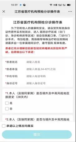 为进一步做好医院疫情防控工作,优化预检分诊流程,减少人群聚集,缩短等候时间。根据苏防救治﹝2021﹞18号文件要求,每一位来院患者必须填写《江苏省医疗机构预检分诊操作表》,否则不能就诊。根据全省统一要求,这是一张诊前必填表,可以在手机上提前填写(无智能手机的老年人及儿童需填写纸质版),省时省力。