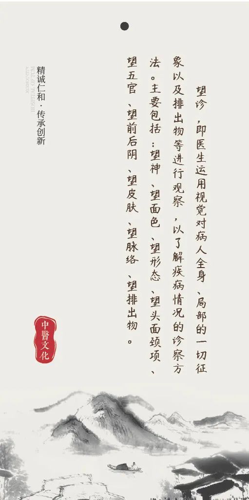 望诊,即医生运用视觉对病人全身、局部的一切征象以及排出物等进行观察,以了解疾病情况的诊察方法。主要包括:望神、望面色、望形态、望头面颈项、望五官、望前后阴、望皮肤、望脉络、望排出物。