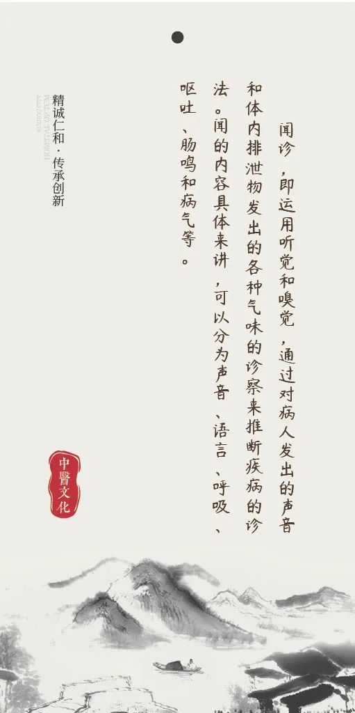 闻诊,即运用听觉和嗅觉,通过对病人发出的声音和体内排泄物发出的各种气味的诊察来推断疾病的诊法。闻的内容具体来讲,可以分为声音、语言、呼吸、呕吐、肠鸣和病气等。