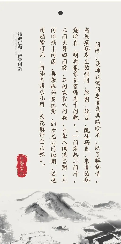 问诊,是通过询问患者或其陪诊者,以了解病情,有关疾病发生的时间、原因、经过、既往病史、患者的病痛所在。明朝张景岳曾编有十问歌:“一问寒热二问汗,三问头身四问便,五问饮食六问胸,七聋八谒俱当辨,九问旧病十问因,再兼眼药叁机变,妇女尤必问经期,迟速闭崩皆可见,再添片语告儿科,天花麻疹全占验。”