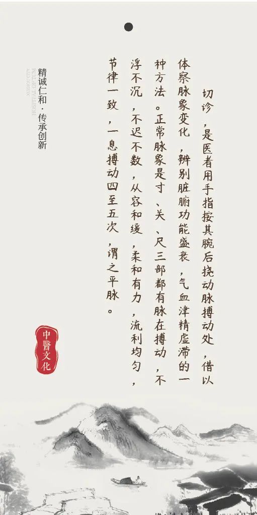 切诊,是医者用手指按其腕后挠动脉搏动处,借以体察脉象变化,辨别脏腑功能盛衰,气血津精虚滞的一种方法。正常脉象是寸、关、尺三部都有脉在搏动,不浮不沉,不迟不数,从容和缓,柔和有力,流利均匀,节律一致,一息搏动四至五次,谓之平脉。