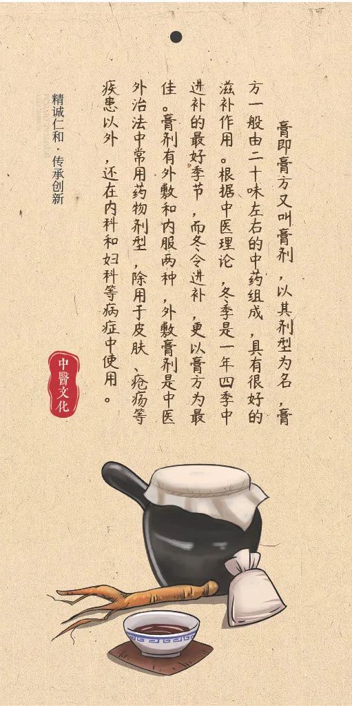 膏即膏方又叫膏剂,以其剂型为名,膏方一般由二十味左右的中药组成,具有很好的滋补作用。根据中医理论,冬季是一年四季中进补的最好季节,而冬令进补,更以膏方为最佳。膏剂有外敷和内服两种,外敷膏剂是中医外治法中常用药物剂型,除用于皮肤、疮疡等疾患以外,还在内科和妇科等病症中使用。
