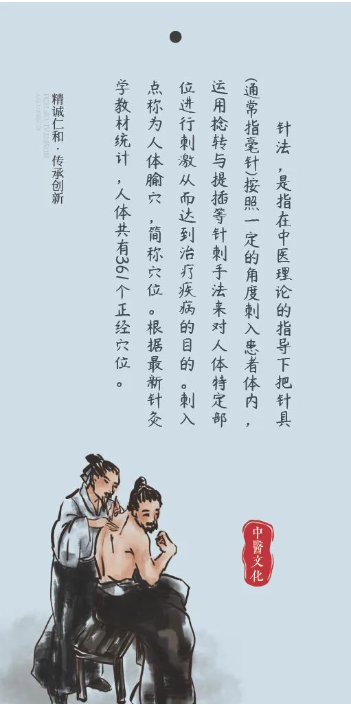 针法,是指在中医理论的指导下把针具(通常指毫针)按照一定的角度刺入患者体内,运用捻转与提插等针刺手法来对人体特定部位进行刺激从而达到治疗疾病的目的。刺入点称为人体腧穴,简称穴位。根据最新针灸学教材统计,人体共有361个正经穴位。