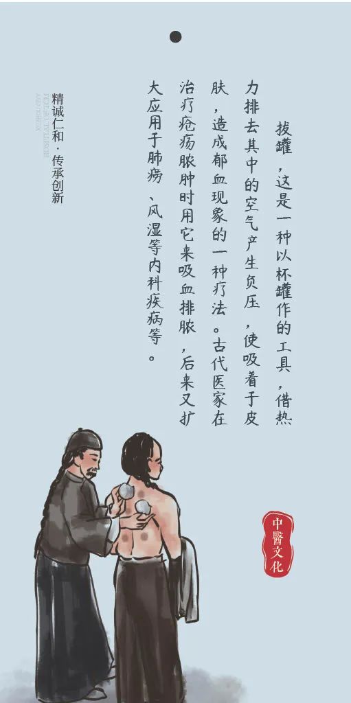 拔罐,这是一种以杯罐作的工具,借热力排去其中的空气产生负压,使吸着于皮肤,造成郁血现象的一种疗法。古代医家在治疗疮疡脓肿时用它来吸血排脓,后来又扩大应用于肺痨、风湿等内科疾病等。