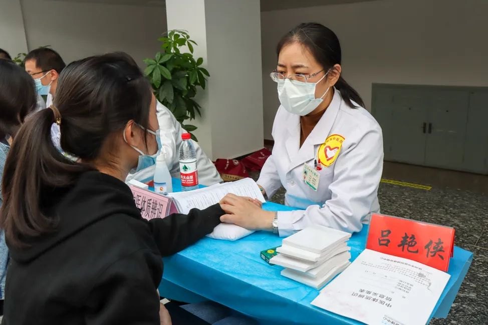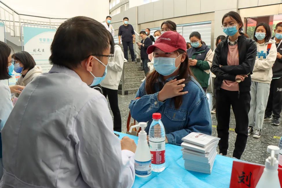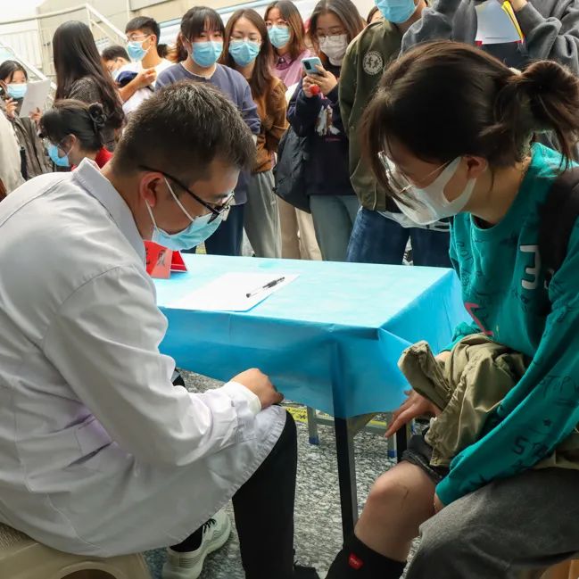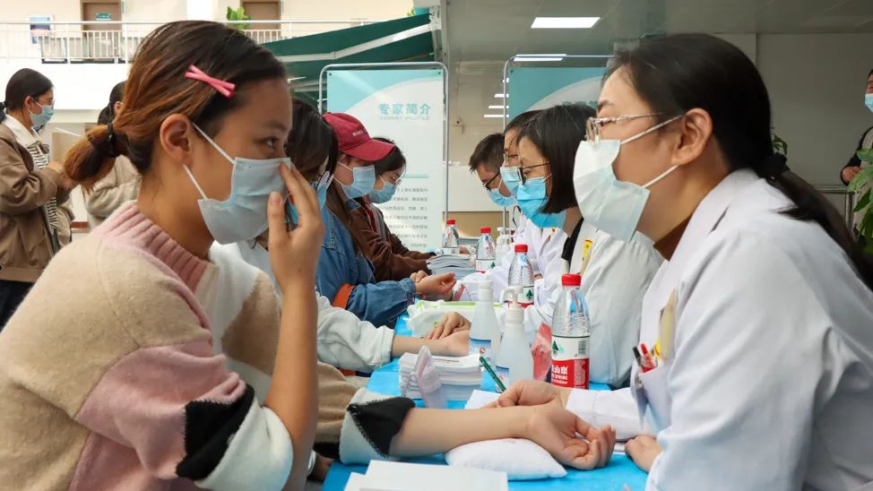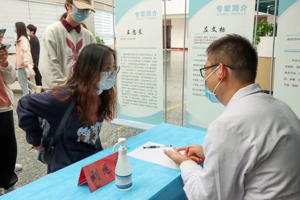 在义诊活动现场,来自徐州市中医院内分泌科、针灸科、推拿科、体检中心的4位专家热情接待每一位问诊学生,为他们把脉,细致询问既往病史,运用扎实的专业知识和丰富的临床经验,耐心解答学生的提问和咨询。