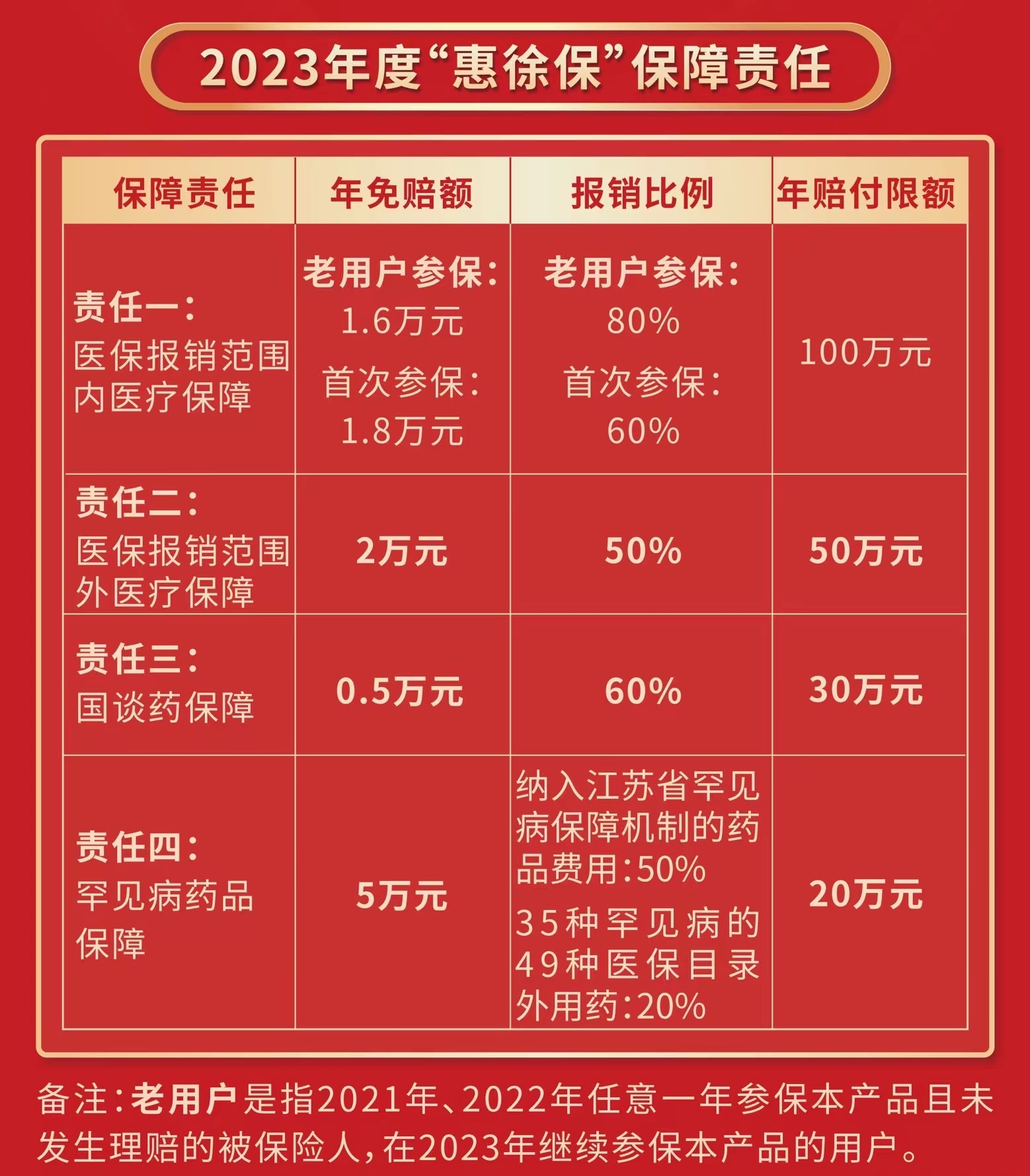 2023年度“惠徐保”主要保障四个方面,包括医保报销范围内医疗保障、医保报销范围外医疗保障、国谈药保障、罕见病药品保障,年赔付额合计最高可达200万元。