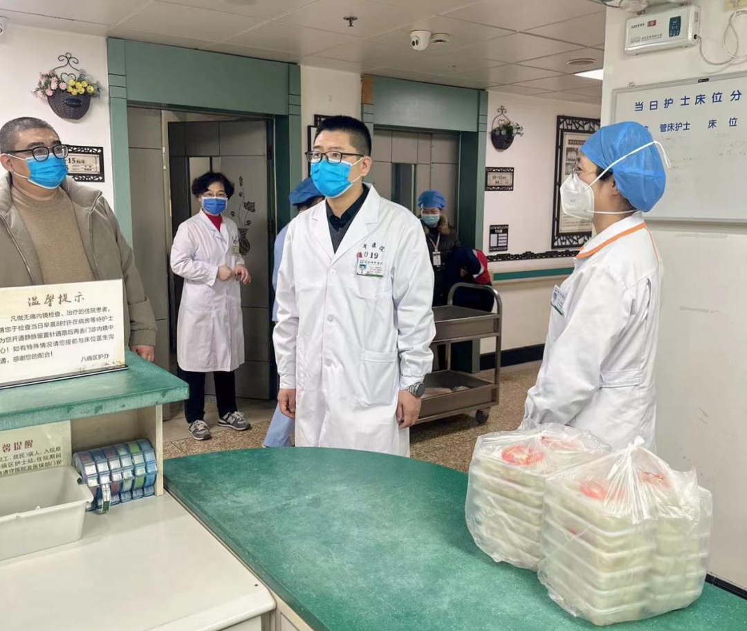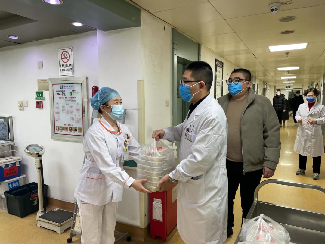 “过年好!”“大家辛苦了!”“给大家拜年了!”每到一处院领导都与坚守岗位的职工亲切交流、互致问候,详细了解各科室工作和门诊、住院患者情况。并表示正是有这样一批“舍小家、顾大家”无私奉献的医护团队,才能保证大家度过一个安定祥和的春节。同时,还叮嘱大家在繁忙的工作中,做好个人防护,要以高度的责任感、饱满的工作热情和精湛的医术,全力以赴做好春节期间医院的医疗护理、后勤保障工作,确保医疗质量安全,为广大患者提供安全、优质、高效的中医诊疗服务。 医院领导的关心和祝福,让一线医护人员倍感温暖和鼓舞,大家纷纷表示,在新的一年里,一定不负众望,坚守好医者仁心,践行好医者使命,为医院高质量发展,为守护人民群众生命安全和身体健康,全力以赴! 春节看望慰问在岗医务人员和住院患者是市中医院坚持多年的传统。为了体恤值班人员和由于身体原因不能回家过年的住院患者,大年三十下午,医院领导还为每一位值班人员和住院患者送去香喷喷的水饺,让大家在医院过年也能感受到“家”一般的温暖。
