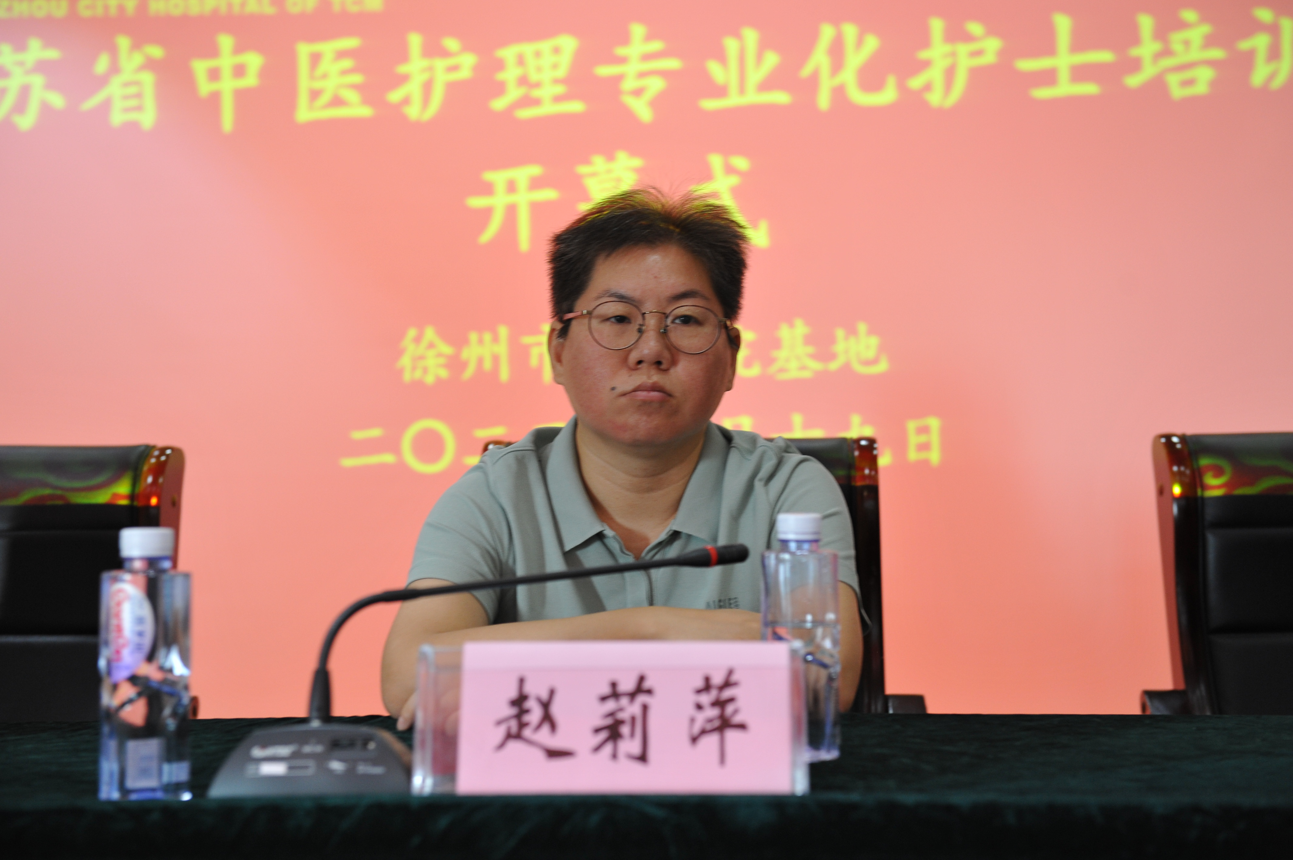 赵莉萍处长讲话,她首先对参加此次培训的来自二级以上医院的统招学员和中医馆的定向学员表示祝贺和欢迎。她在讲话中指出:第一、要充分发挥中医护理专业化护士在非药物疗法和外治疗法的作用。第二、建立激励机制,发挥中医护理专业化护士、中医护理专科护士等人才的作用,做到学有所成,学有所用。