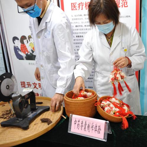 活动现场,当日就诊患者凭挂号单免费领取中药保健香囊一枚。