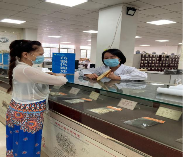 中药房取药窗口,中药师免费为患者提供中药用药咨询、用药指导等服务。