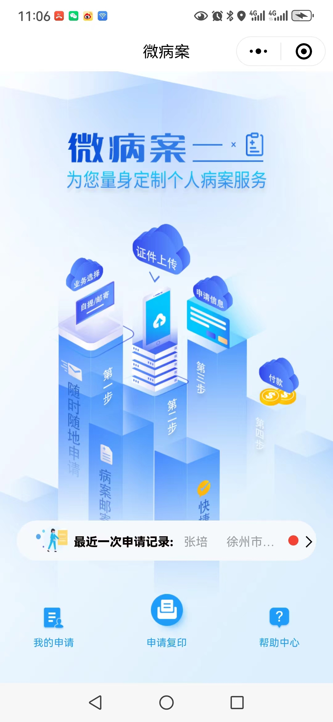 申请人于患者出院10个工作日后(节假日顺延),在【徐州市中医院】微信公众号【智慧医院】菜单栏点击【病案复印】,进入微病案小程序后进行申请。