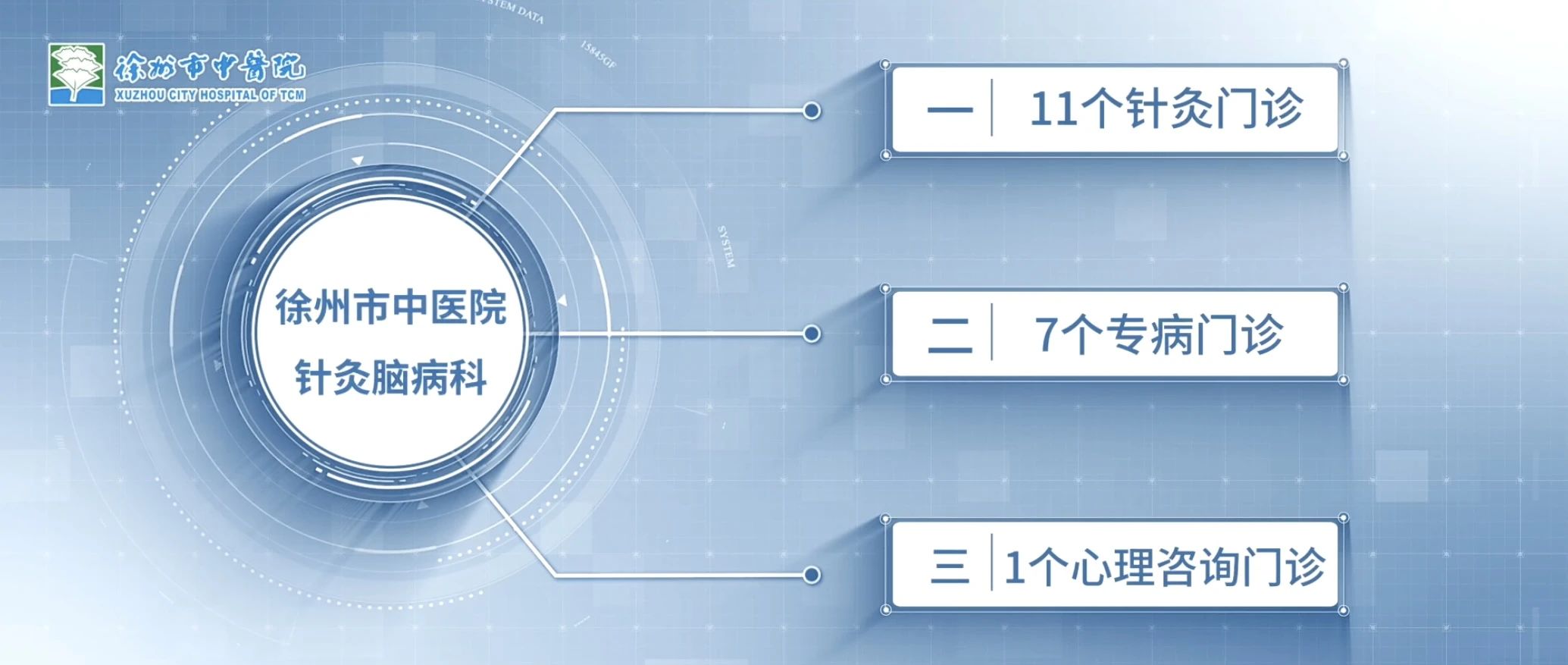 徐州市中医院针灸脑病科,是国家级十二五重点专科建设单位、江苏省中医临床重点专科,徐州市中西医结合脑病诊疗中心,目前设有11个针灸门诊,7个专病门诊,1个心理咨询门诊,共设有180张床位,门诊年诊治患者8万多人次,年出院病人近6000人次。