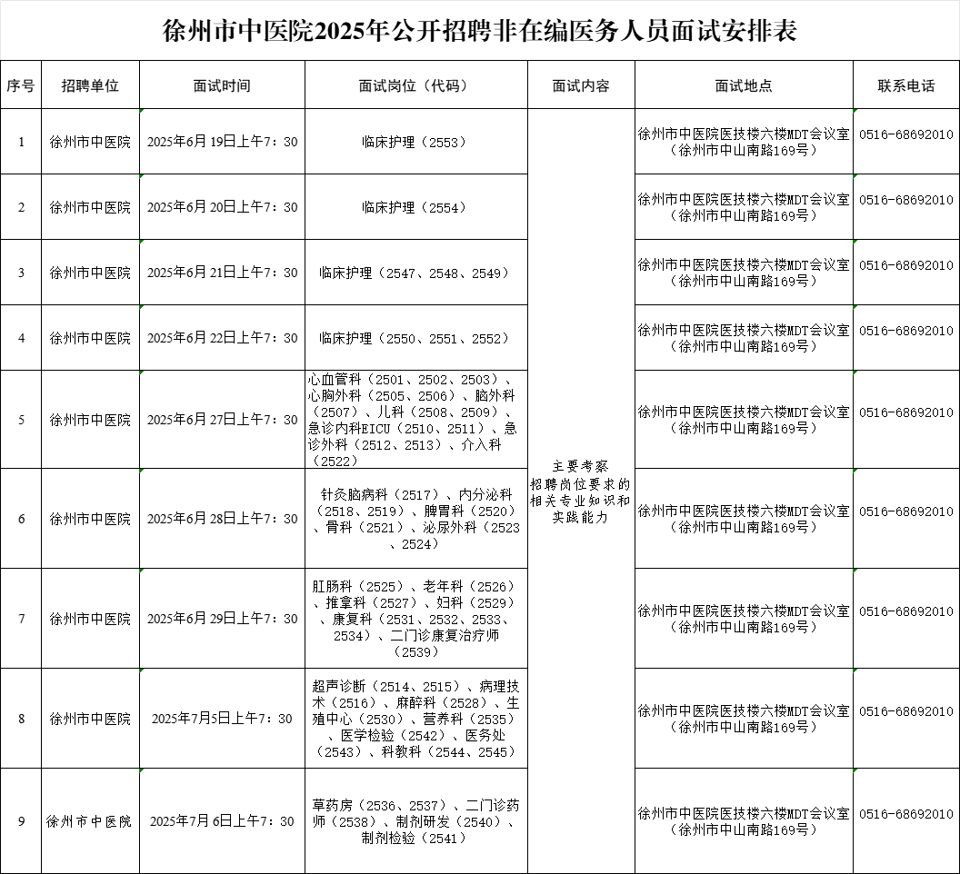 根据《徐州市中医院2025年公开招聘非在编医务人员公告》要求,现将徐州市中医院公开招聘非在编医务人员面试有关事项通知如下: