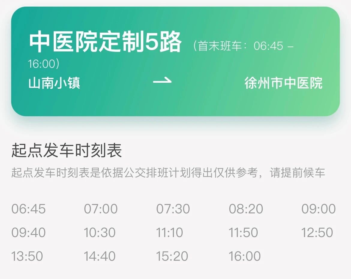 定时发车 每日早晨6:40从山南小镇首发,16:00末班;返程则从徐州市中医院8:45发车,17:30为最后一班。时间安排充分考虑了就医需求,灵活便捷。