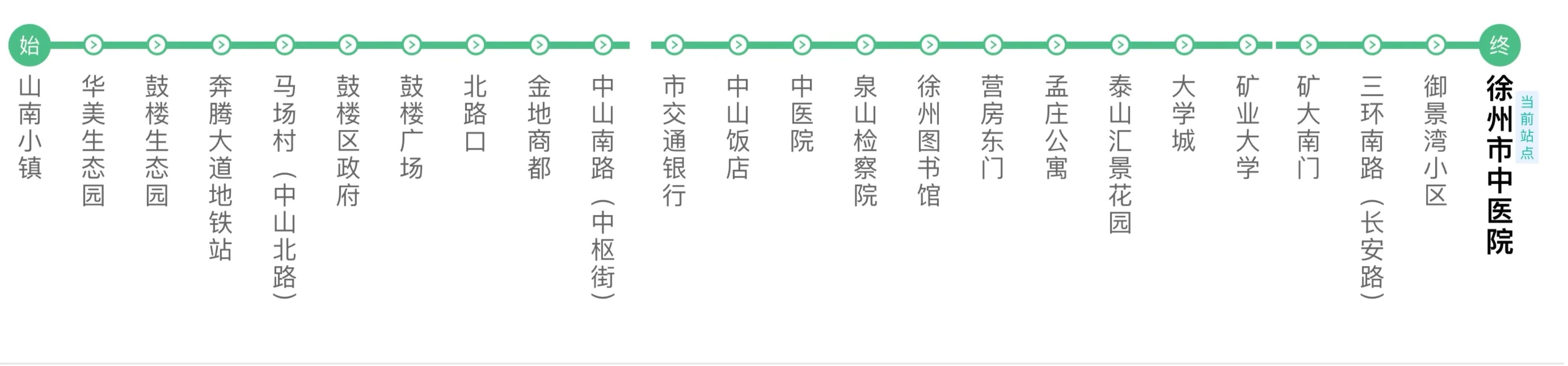 山南小镇、华美生态园、鼓楼生态园、奔腾大道地铁站、马场村(中山北路)、鼓楼区政府、鼓楼广场、北路口、金地商都、中山南路(中枢街)、市交通银行、中山饭店、中医院、泉山检察院、徐州图书馆、营房东门、孟庄公寓、泰山汇景花园、大学城、矿业大学、矿大南门、三环南路(长安路)、御景湾小区、徐州市中医院。