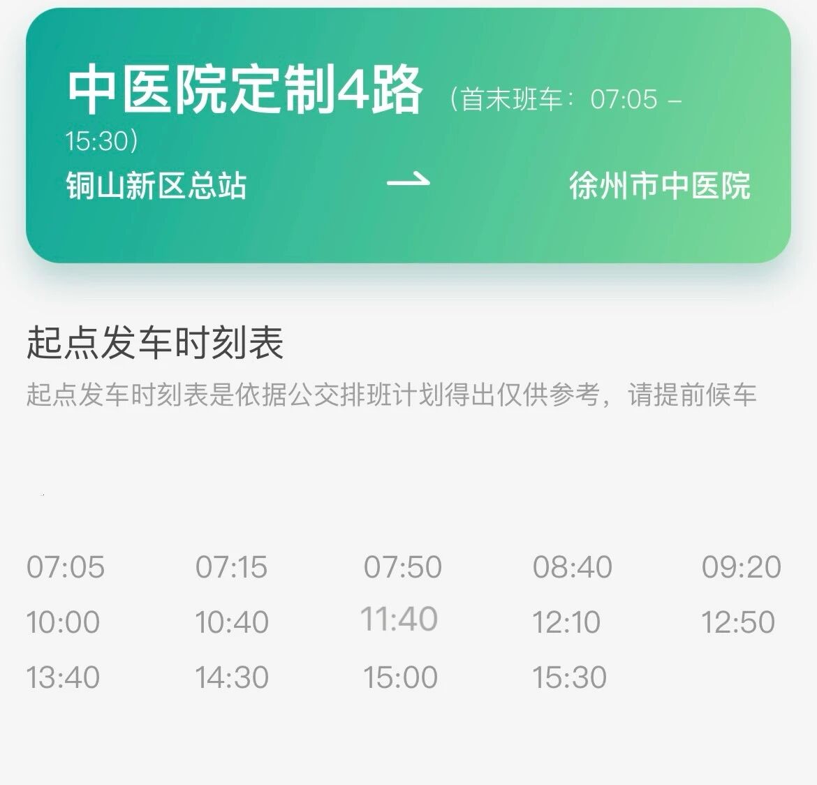 定时发车 每日早晨7:00从铜山新区总站首发,末班车15:30发出;返程则从徐州市中医院8:10开始,最后一班17:00发车。时间安排充分考虑了就医需求,灵活便捷。