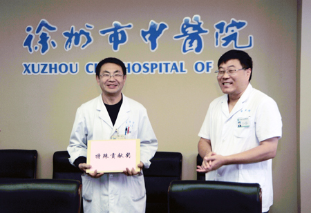 市中医院党委今天上午表彰了救助倒地老人好医生、骨科副主任、主任医师何秉辉,党委书记王心力同志宣读了表彰决定,院长王培安同志向何秉辉颁发了特殊贡献奖。院党委号召全院职工向何秉辉同志学习,学习他爱岗敬业、有情有义、关爱病人、见义勇为,全心全意为人民健康服务的精神。