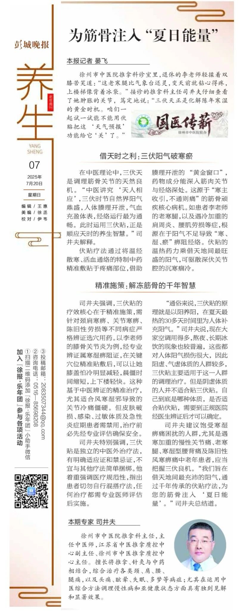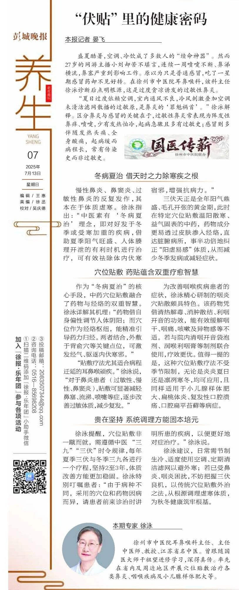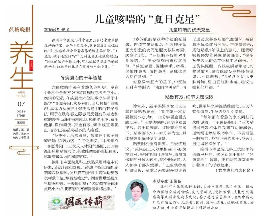 盛夏三伏,阳气鼎盛,正是中医“冬病夏治”的黄金时节。在这一时节,通过穴位贴敷等中医外治法,可以有效祛除体内沉寒痼疾,增强体质,预防冬季易发疾病。 徐...