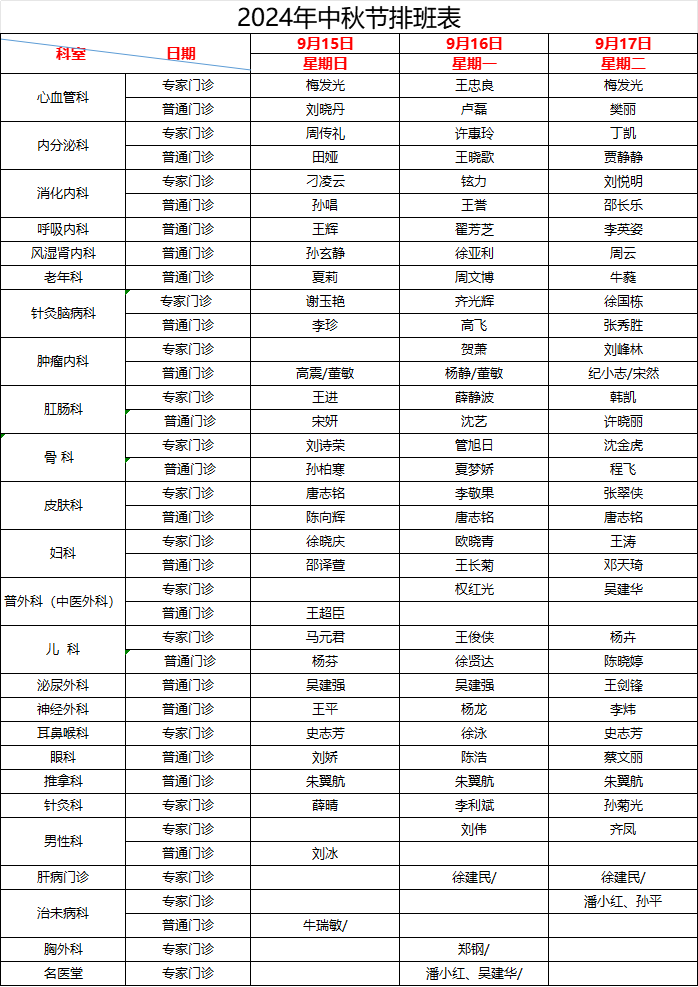 根据国家相关规定,结合医院的具体情况,经医院研究决定,徐州市中医院2024年中秋节假期门急诊工作安排如下: 一、放假时间: 9月15日...